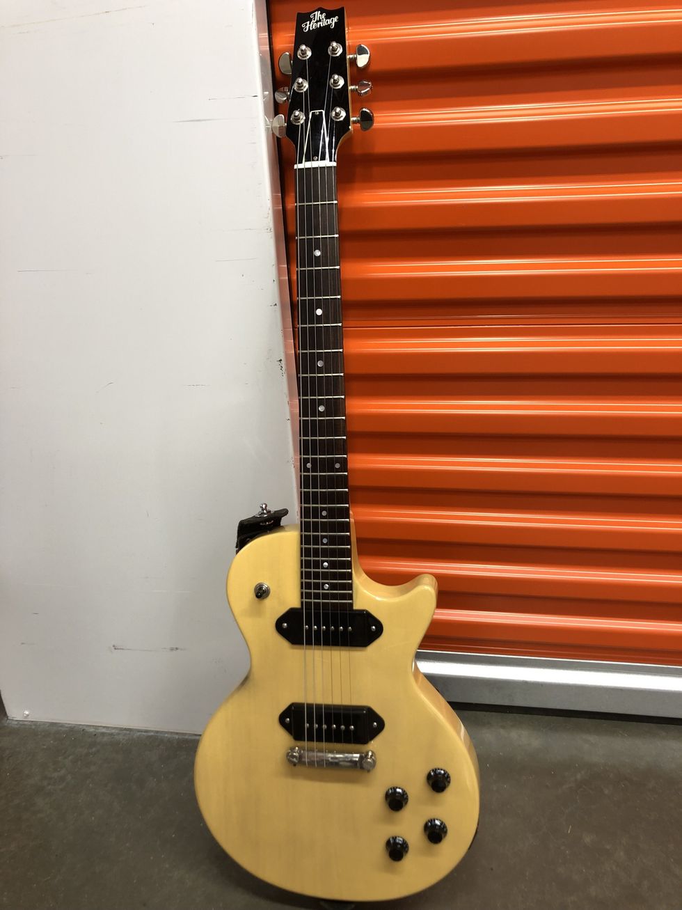 This Heritage H-137 features Lollar P-90 pickups and stays in standard tuning with StringJoy strings (.095-.046). Sharrard uses Magslide pinky-model slides and Jim Dunlop Primetone picks.