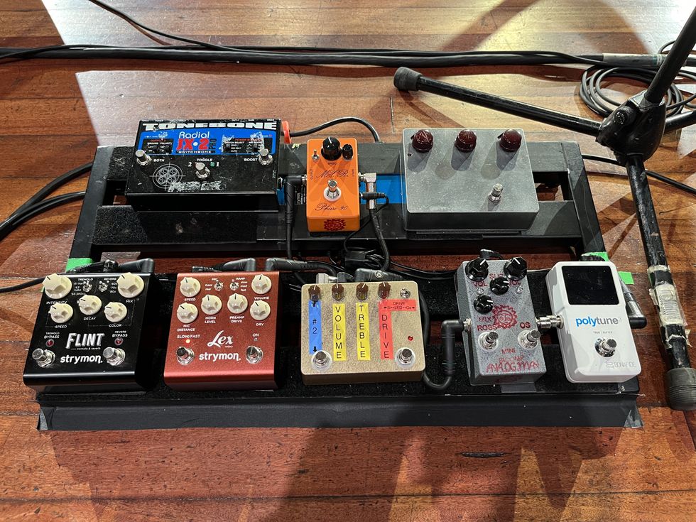 Sharrard’s pedalboard contains a TC Electronic PolyTune, Analog Man Bi-CompROSSor, custom Klon made by Charlie Martinez, Strymon Lex Rotary Speaker Simulator, Strymon Flint, Radial Switchbone for when both amps are in use, a backup PCE-FX Aluminum Falcon, and Radial DI for acoustic guitar.