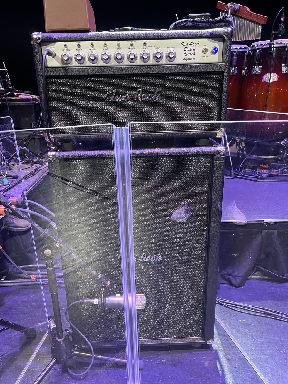 Sharrard tours with three amps, and runs either one or two depending on the size of the venue. On this show, he ran a Two Rock Classic Reverb 100/50-watt head with a 2x12 vertical closed back cabinet, loaded with Celestion Heritage G12-65 speakers