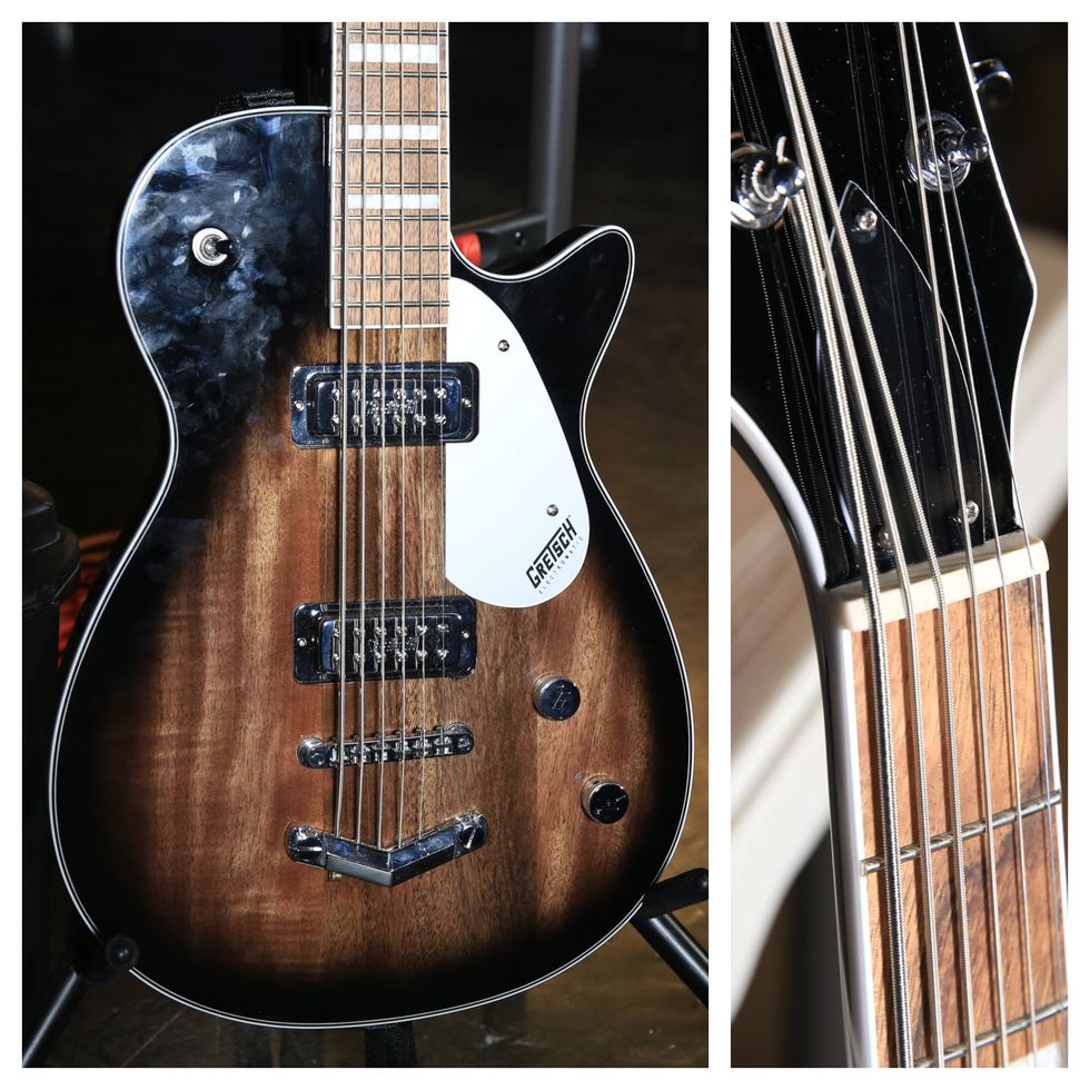 He played a Squier Vintage Modified Jazzmaster for years before landing on this current Gretsch G5260 Electromatic Jet Baritone that’s been getting it done since releasing 2020’s I Let It In and It Took Everything. It’s all stock aside from the nut filed open to hold Bickerstaffe’s monstrous .105 nickel bass string in the low-E position. The other five strings are from a pack of D’Addario EXL157 Medium Nickel Wound Electric Baritone set (.014–.018–.026w–.044–.056). He moves between a custom E (E–A–E–A–D–F#) and standard B tunings, and the .105 bass string helps keep the tension in a similar range.