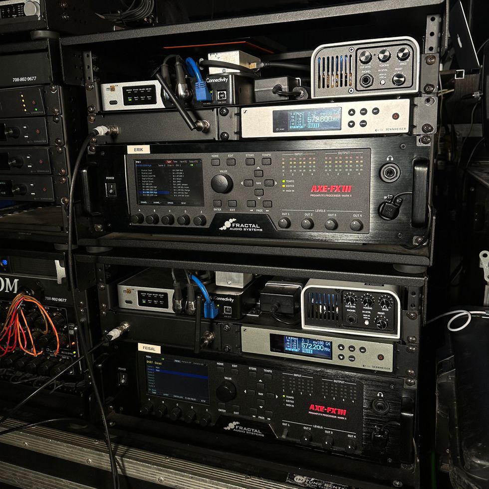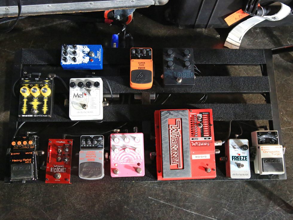 To keep things interesting and fun, Bickerstaffe does still tour with a proper pedalboard, but you’ll notice it’s more a place for experimentation than execution because several pedals are on their way in or out as they’re not being powered or in the chain. As of May 1 in Nashville, these are the tone twisters Erik had on deck: EarthQuaker Devices Zoar, Behringer SF300 Super Fuzz, 141FX Pillager, Third Man Mantic Flex, Electro-Harmonix Mel9, Boss HM-2 Heavy Metal, DigiTech Whammy Ricochet, Behringer FX600 Digital Multi-FX (his first pedal), EarthQuaker Devices Rainbow Machine, Electro-Harmonix Freeze, and a Boss TU-3 Chromatic Tuner. And there is one crucial pedal that he prefers over the Axe-Fx III option and that’s the DigiTech Whammy and its octave blend.