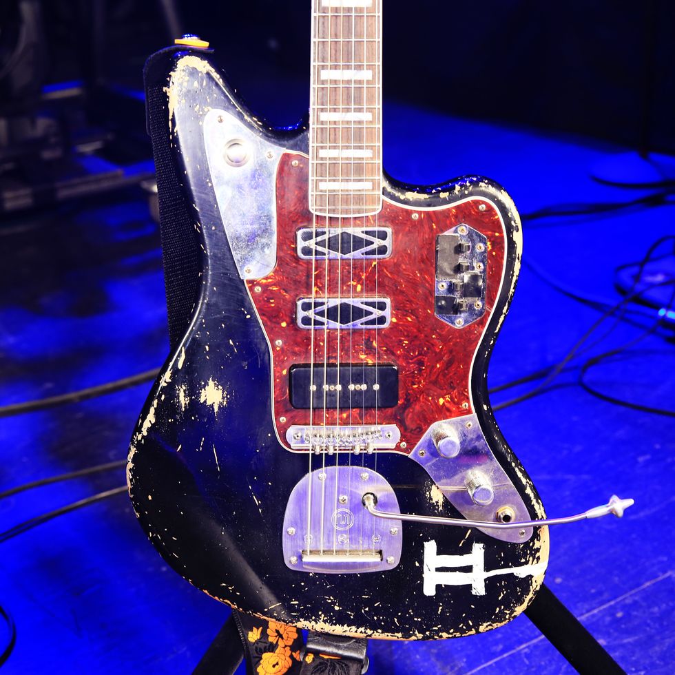 This Fender “Jazzmaster” was a special order made by Dennis Galuszka in Fender’s custom shop. Frank’s friend (and occasional PG contributor) Mike Adams (the “Obi-Wan of offsets”) scooped up a ’60s Jazzmaster from the corner of a flooded-out basement somewhere, and after some fix-ups, nicknamed it “Pancake” for its flat, playable neck. Iero was obsessed with it, and asked his friend if he’d loan “Pancake” to Galuszka to scan and recreate the neck. The first result of that collaboration goes on tour with My Chemical Romance, while this second one comes out with L.S. Dunes. It’s got a 25.5′′ scale length—Iero calls it his “Jag and a half”—and comes out for the last three songs of the set. It rocks blacked-out goldfoil pickups in the neck and middle positions, and a P-90 in the bridge. There’s a built-in killswitch on the upper bout, too.