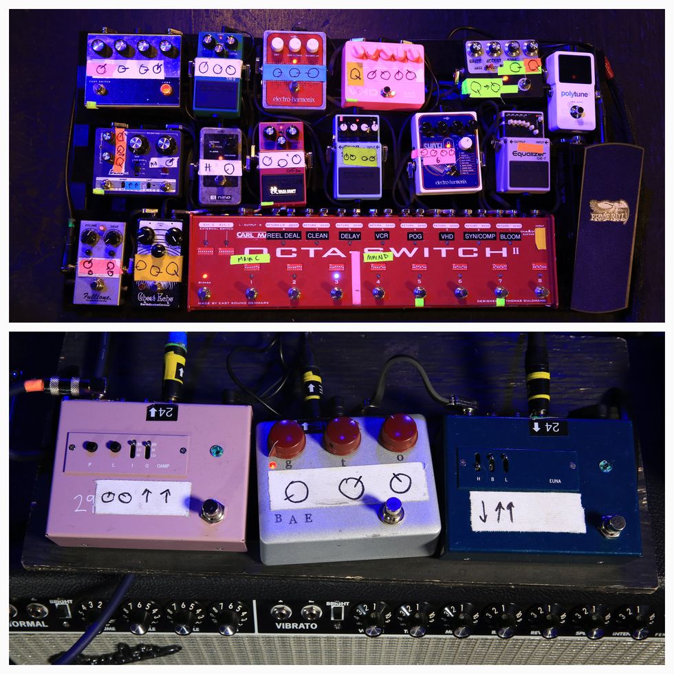 Iero’s second, always-on board stays safe behind his amp. It has a 29 Pedals OAMP, Bowman Audio Endeavors Bowman Overdrive, and 29 Pedals EUNA, which form the basis of his tone.