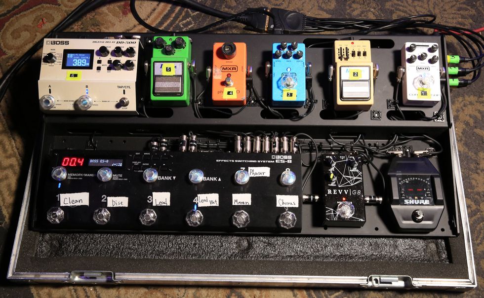 Friedman asked Sosa to build him a board based on his needs, and Sosa delivered this no-frills stomp station, which he operates backstage during the show. First, Friedman’s signal hits a Revv G8 noise gate which the tech dubs the most important pedal; he has his hand on it the whole show, tweaking its settings for different parts. After, there’s an MXR M87 bass compressor for clean tones, Maxon AF-9 Auto Filter, MXR Analog Chorus, MXR Phase 90, Ibanez Tube Screamer, and a Boss DD-500. Friedman runs to his board via a Shure GLXD6+ wireless system, and a Boss ES-8 switching system helps simplify Sosa’s job.