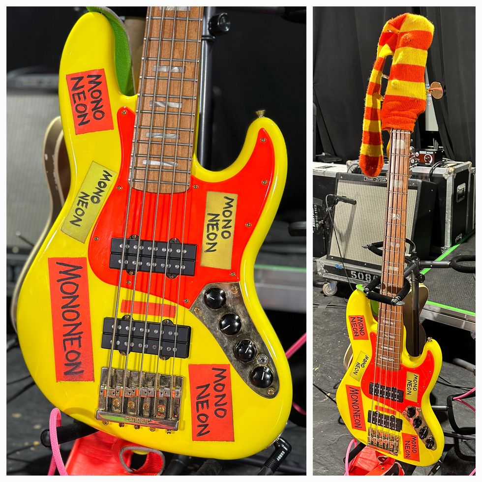 This Fender MonoNeon Jazz Bass V was created after a rep messaged Thomas on Instagram to set up the signature model, over which Thomas had complete creative control. Naturally, the bass is finished in neon yellow urethane with a neon orange headstock and pickguard, and the roasted maple neck has a 10"–14" compound radius. It’s loaded with custom-wound Fireball 5-string Bass humbuckers and an active, 18V preamp complete with 3-band EQ controls. Thomas’ own has been spruced up with some custom tape jobs, too. All of MonoNeon's connections are handled by Sorry Cables.
