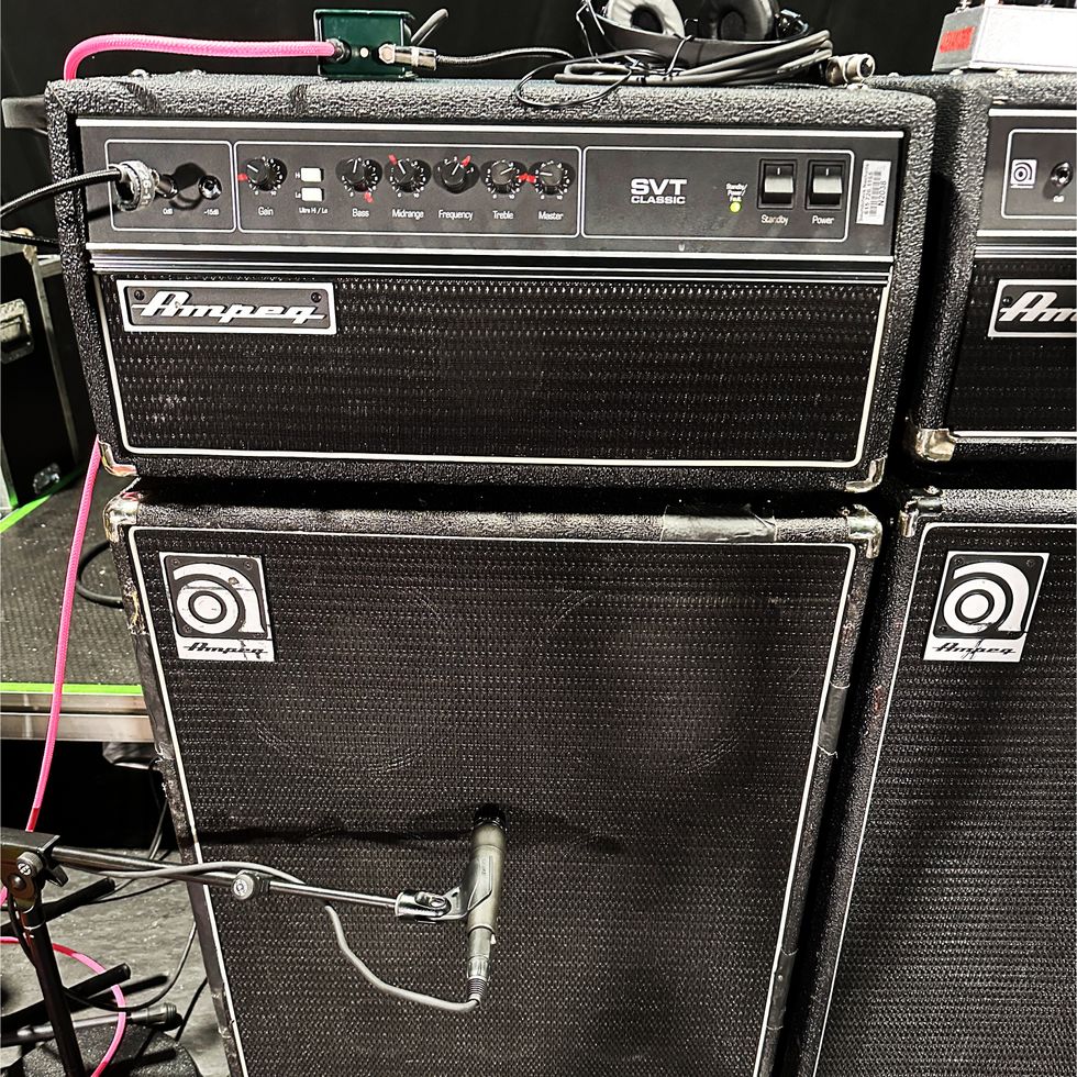 MonoNeon’s Ampeg SVT stack isn’t a choice of passion. “That’s what they had for me, so I just plugged in,” he says. “That’s what I have on my rider. As long as it has good headroom and the cones don’t break up, I’m cool.”