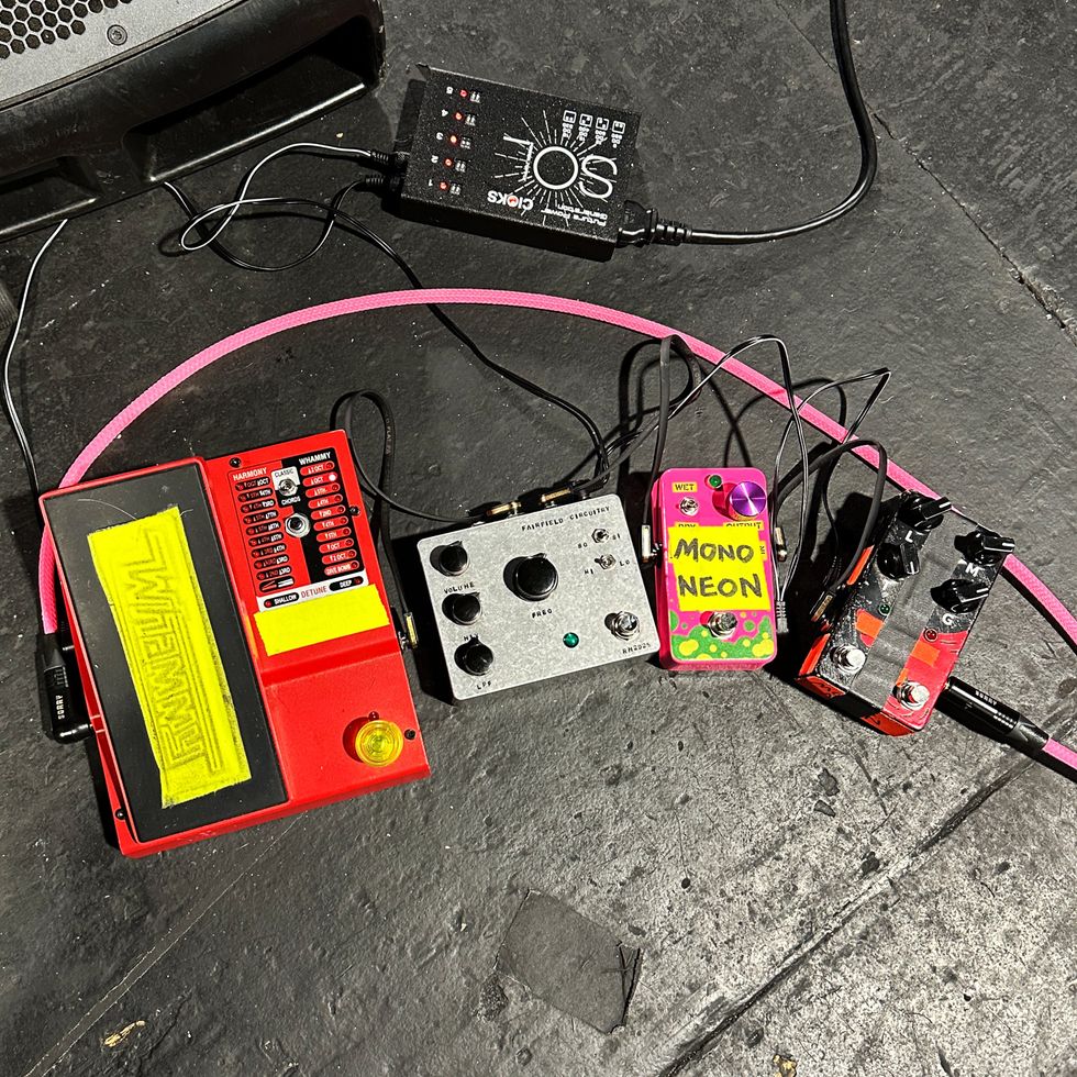 Alongside the Whammy, MonoNeon runs a Fairfield Circuitry Randy’s Revenge (for any time he wants to “feel weird”), a literal Fart Pedal (in case the ring mod isn’t weird enough, we guess), and a JAM Pedals Red Muck covers fuzz and dirt needs. A CIOKS SOL powers the whole affair.