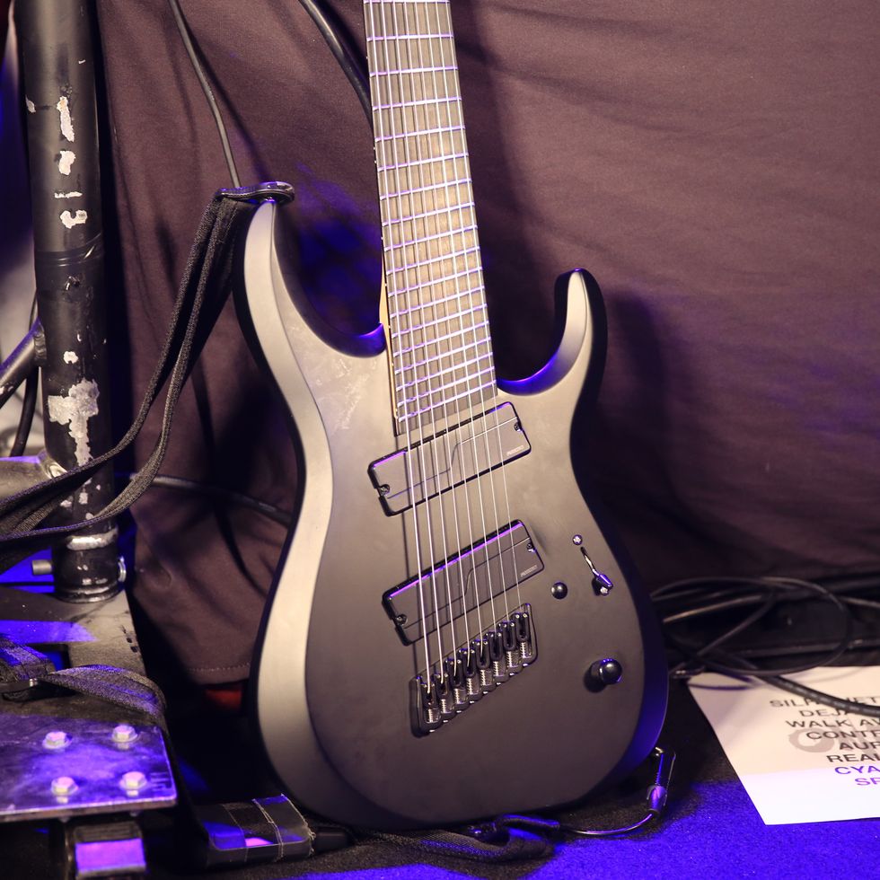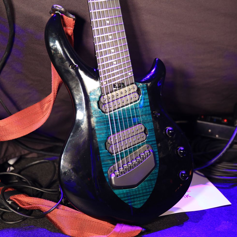Jared Dines also needed an 8-string for Oni, so Ernie Ball sent him this Music Man Majesty 8, a John Petrucci signature model. It’s got Fishman’s Powerbridge piezo system, which sees action on the song “Control.” Dines attached his own string clamp behind the nut to halt noise.