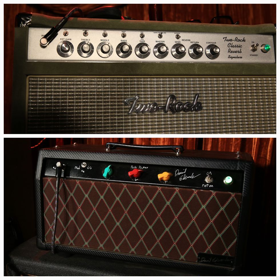 Schull runs two amps onstage, but he doesn’t run them in stereo; he believes the stereo image doesn’t translate as well in a live situation where listeners are spread across the speaker system’s field. With this Two-Rock Classic Reverb Signature and an AC15-ish David Edwards Apollo, Schull gets a “broadband” sound set for big, fat clean tones, like one giant amp on the edge of breakup.