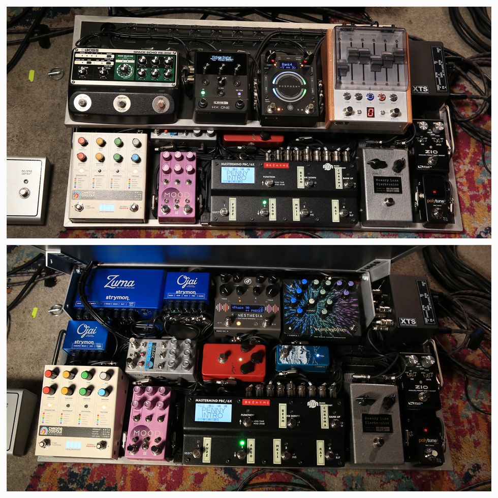 In addition to those machines, the rig includes a Chase Bliss Dark World, GFI System Synesthesia, Hologram Electronics Chroma Console, Boss Space Echo RE-202, GFI System Duophony (which mixes the Dark World and Synesthesia), Chase Bliss Automatone Preamp MkII (used for boost, EQ, fuzz, or overdrive depending on the song), Old Blood Noise Endeavors Beam Splitter, Source Audio ZIO, Memory Lane Electronics Tone Bender clone, and a Mythos Argonaut. A mysterious Japan-made Noel dirt pedal, finished in striking red and gifted to Shull by JHS Pedals’ Josh Scott, rounds out the collection. Utility boxes include a TC Electronic PolyTune3 Noir, Lehle Little Dual, a pair of Strymon Ojai power supplies, and a bigger Strymon Zuma supply.