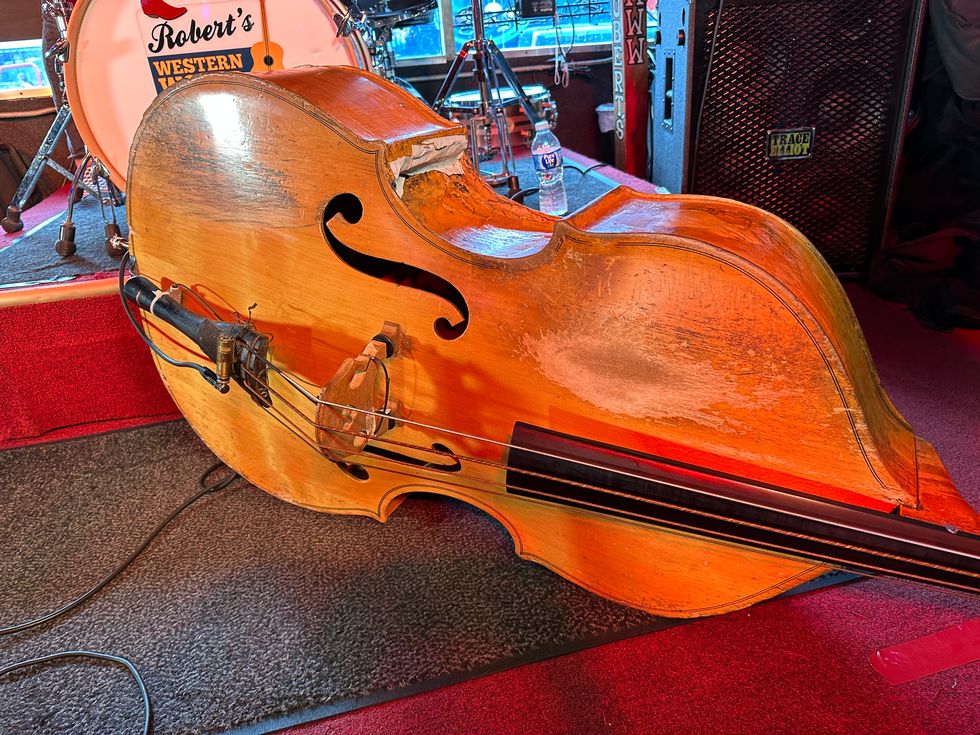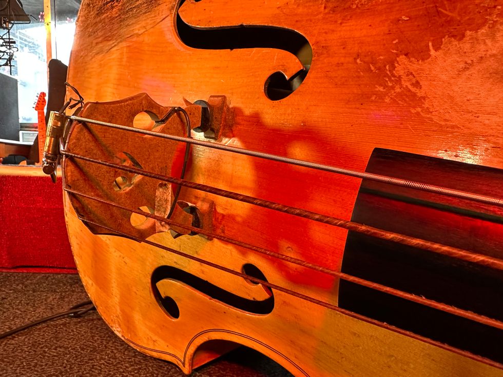 Joe Fick plays an Engelhardt Swingmaster bass that he bought brand new in 2004, and keeps it strung with Efrano gut strings (plain G, D, and A strings, plus a wrapped E). Fick uses a Barbera Transducers bridge pickup, which runs straight into Robert's Western World’s new house rig: a Fender Rumble 500 paired to two Trace Elliot Pro 4x10 speaker cabinets. The backup rig is a Peavey Pro Bass 500 head with a Peavey Tour 4x10, which belonged to the late, great local legend Dave Roe.