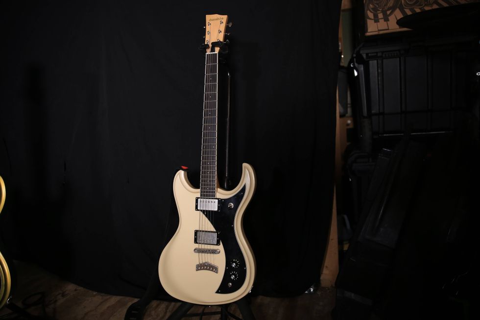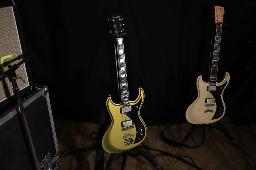 The white Dunable has a maple neck, a 25.5” scale, and is tuned lower, with a .062 for the low E string. It’s used for drop-A tunings, and has the same DiMarzio pickups.