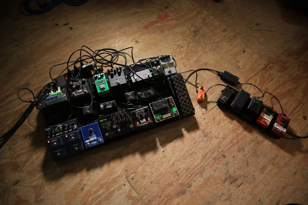 Sullivan runs two pedalboards. The first includes a Peterson tuner, Shure P9HW, Dunlop CBM95 Cry Baby Mini, DigiTech Drop and Whammy Ricochet, and MXR Phase 95.
