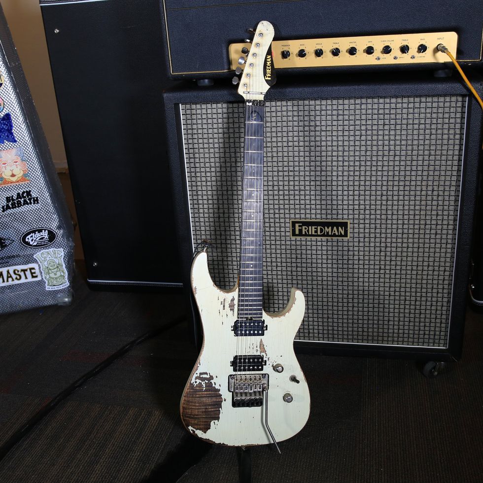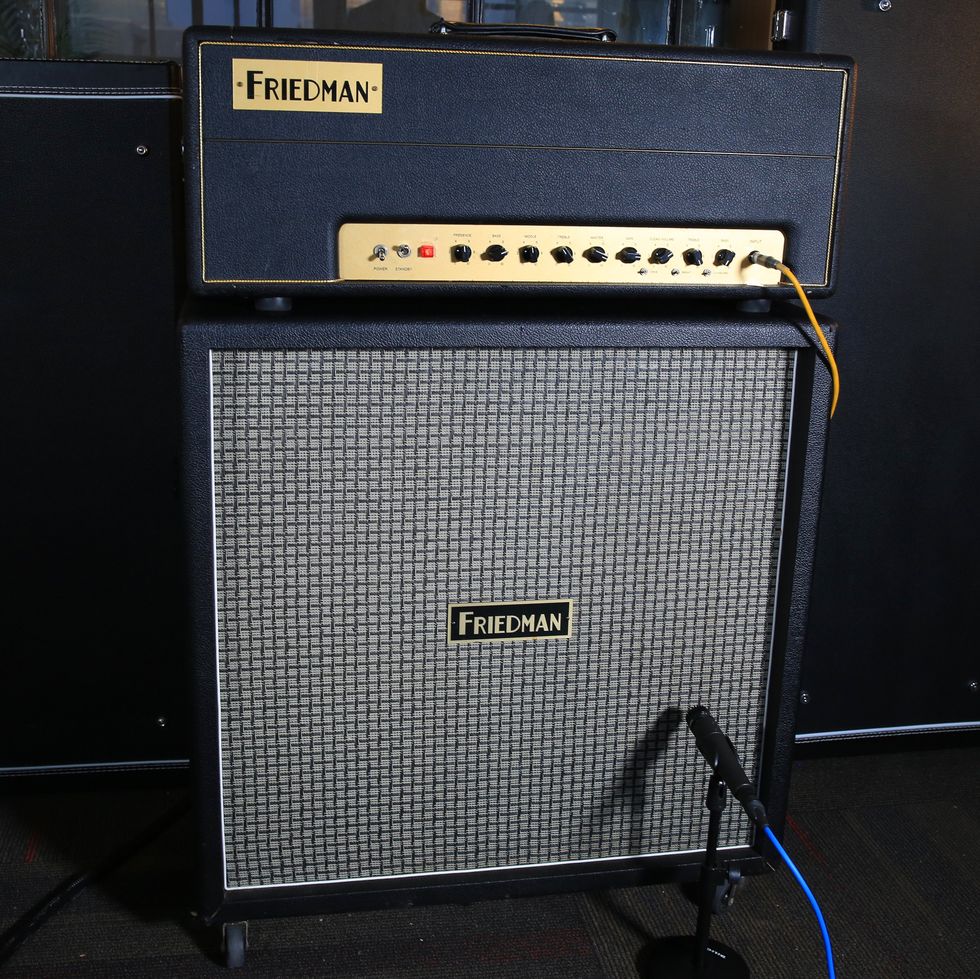 “I think I tried every amp out there,” jokes Boller. “But as soon as I plugged into one of these, I was like, ‘I’m done!’” The Friedman BE-100 has been his go-to amp for over seven years. The amp’s lively, supercharged plexi tone matched with modern appointments (three channels, effects loop, toggles for voice, bright, and cln-be-hbe) makes it a Swiss Army knife for Boller. Underneath the head, is a checkered Friedman 100-watt 4x12 cab outfitted with a pair of Celestion Vintage 30s and a couple of Celestion Creamback 25s.