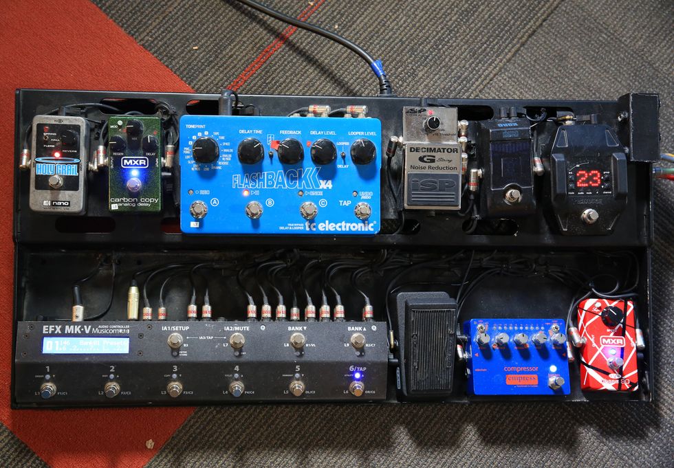 In front of the Musicomlab EFX MK-V Audio Controller, Boller has routed his Shure GLXD16+ digital wireless pedalboard unit, Korg Pitchblack Tuner, MXR EVH Phase 90, Empress Compressor (to lift his clean tapping parts), Dunlop CBM95 Cry Baby Mini Wah, and ISP Technologies Decimator II G-String that has two signals before and in the effects loop. The three other pedals in the BE-100’s effects loop are an Electro-Harmonix Holy Grail, MXR Carbon Copy, and a TC Electronic Flashback X4. Everything rides on the Friedman Tour Pro 1529 Platinum pedalboard.