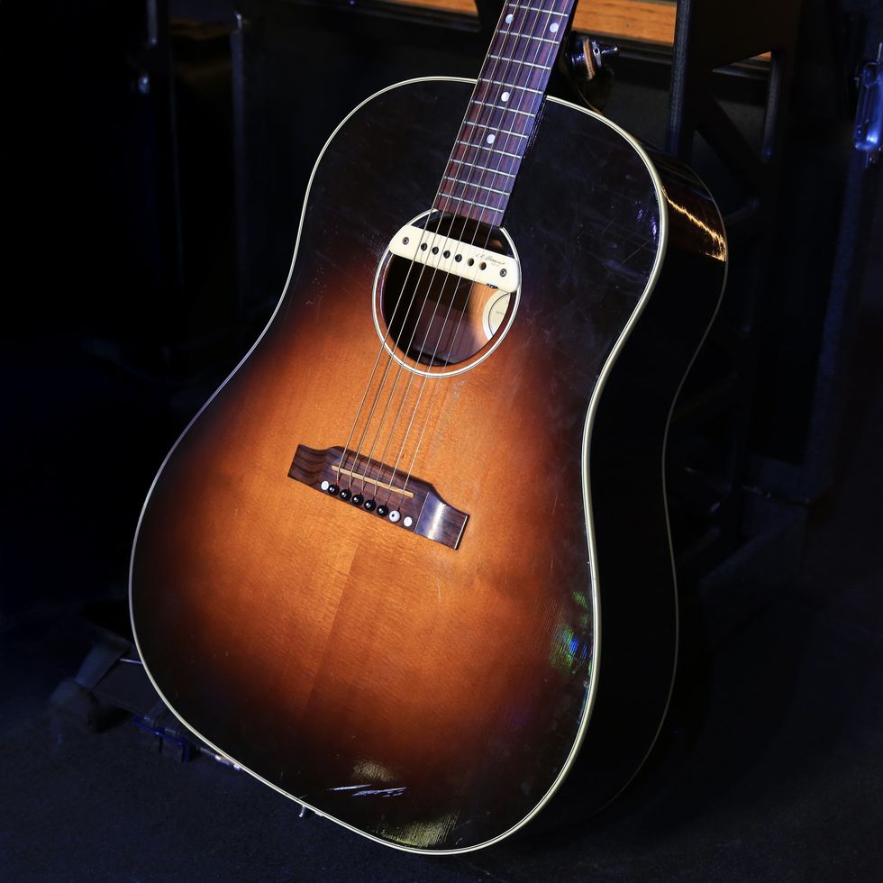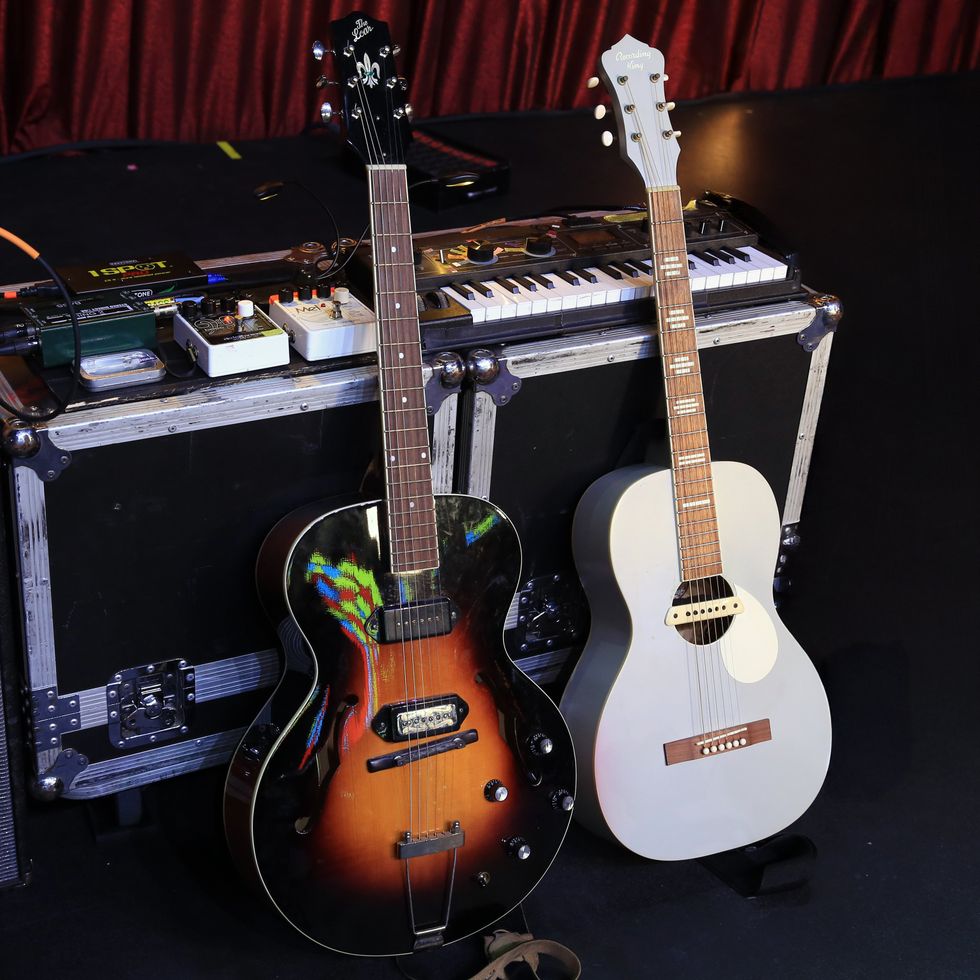 These second-stringers—a Loar archtop and an LR Baggs-equipped Recording King—are on hand in case of broken strings or other malfunctions.