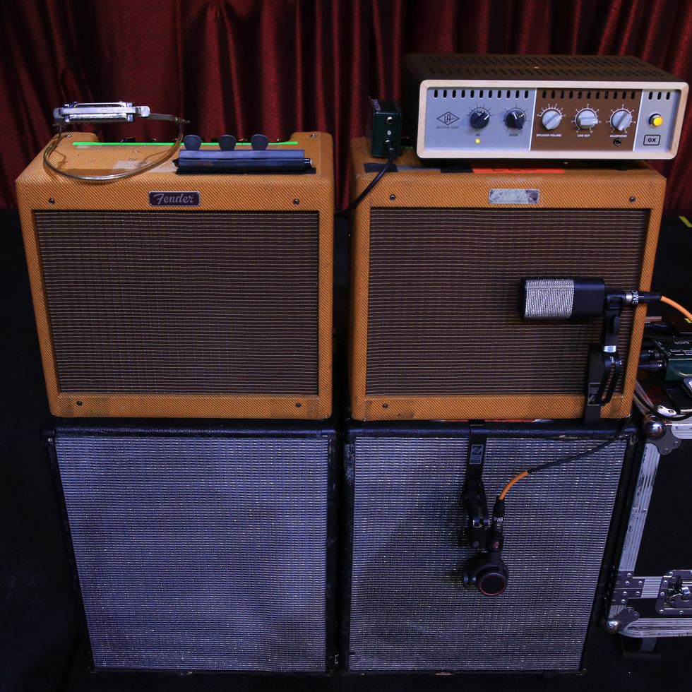 Trent doesn’t trust amps with too many knobs, so this tweed Fender Blues Junior does the trick. It can get fairly loud, so there’s a Universal Audio OX Amp Top Box on hand to tame it for some stages.