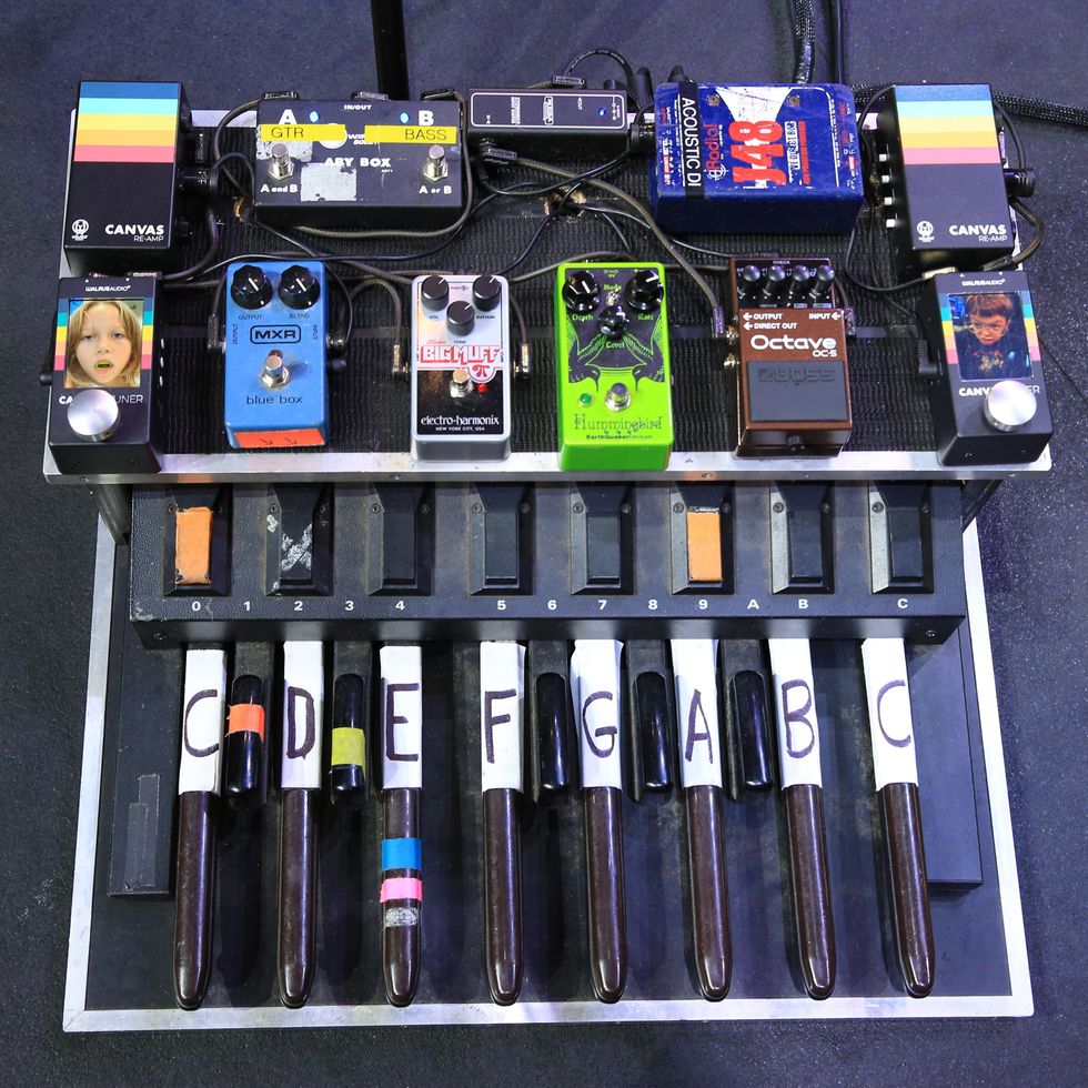 Because Trent and Hearst trade off bass, guitar, keys, and percussion duties, all four of their limbs are active through the set. Whoever is on guitars works this board, with an MXR Blue Box, Electro-Harmonix Nano Big Muff, EarthQuaker Devices Hummingbird, and Boss OC-5, plus a pair of Walrus Canvas Tuners for the electric and acoustic. Utility boxes on the board include a Walrus Canvas Passive Re-Amp, Radial J48, Livewire ABY1, and a Mesa Stowaway input buffer.