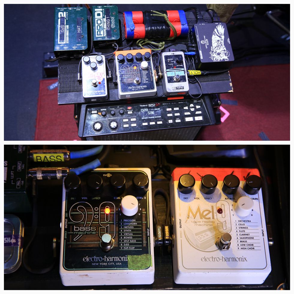 The board for “Thing 2,” beside the guitar amps, includes an EHX Mel9 and Bass9 powered by a Truetone 1 SPOT Pro, plus a Radial ProD2.