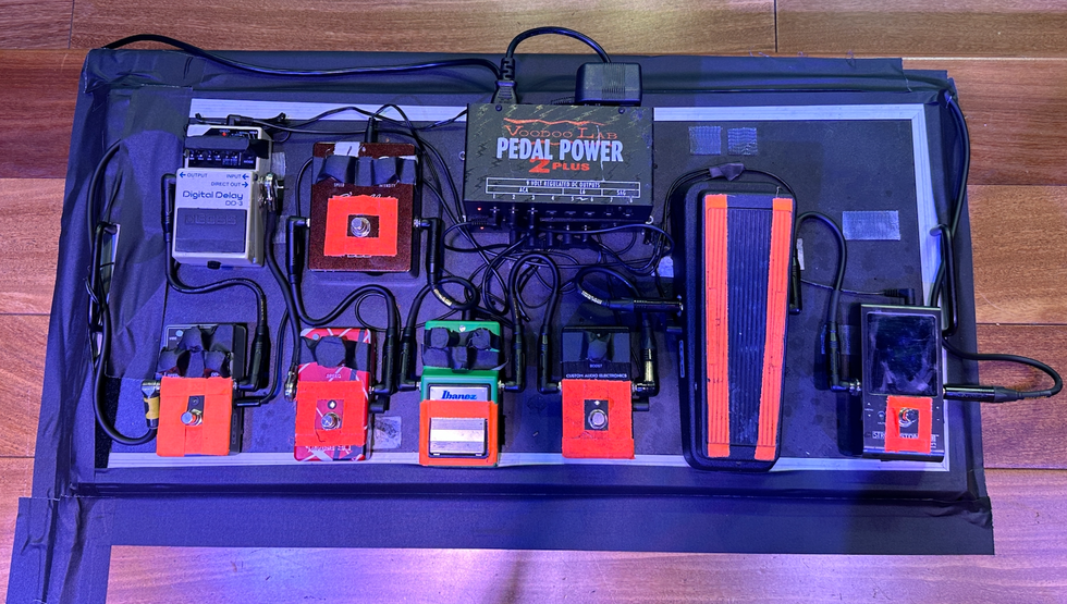 All pedals are taped down with their settings dialed-in. When his signal leaves the board, it hits a Whirlwind Selector A/B box, where it splits off between his amps and his Talkbox rig.