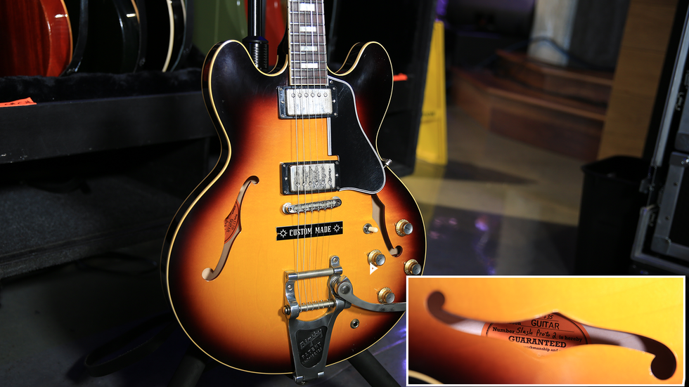 This prototype of the limited Collector’s Edition reproduction of Slash’s 1963 ES-335 sports a vintage sunburst finish with Murphy Lab light aging to match his original. It also includes a Bigsby B7 vibrato tailpiece, unpotted Custombucker pickups, and period-correct nylon saddles.