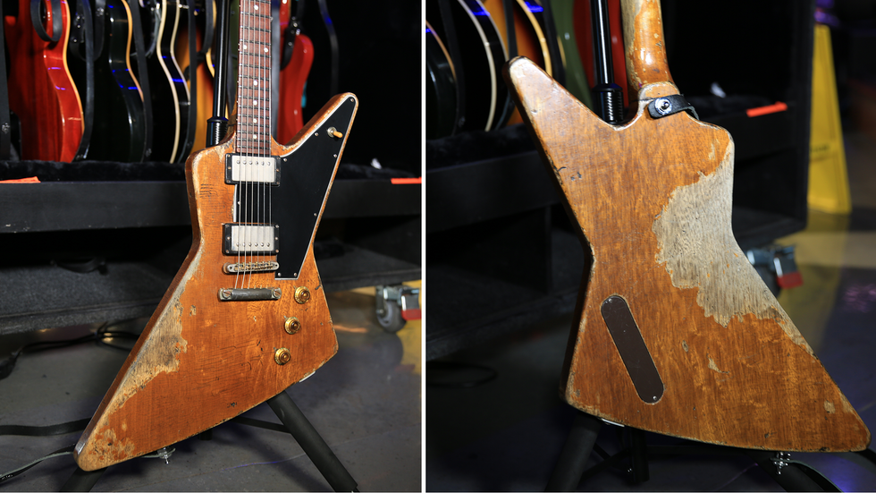 This heavily relic’d Gibson Custom Shop Master Artisan Collection Leo Scala Explorer was built to ’58 specs by luthier Leo Scala. (Tech Ace Bergman notes that it was influenced by the famous Big Ed 1958 Gibson Explorer.) “It’s a real special guitar; he loves it a lot,” says Bergman.
