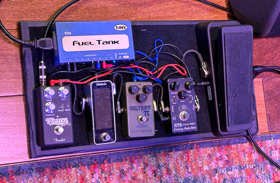 Neal keeps a modest pedalboard at his feet, which is loaded up with a D’Addario Chromatic Pedal Tuner, Dunlop Cry Baby, XTS Custom Pedals Precision Multi-Drive, EHX Green Russian Big Muff, and a Fender Waylon Jennings Phaser, all powered by a T-Rex Fuel Tank.