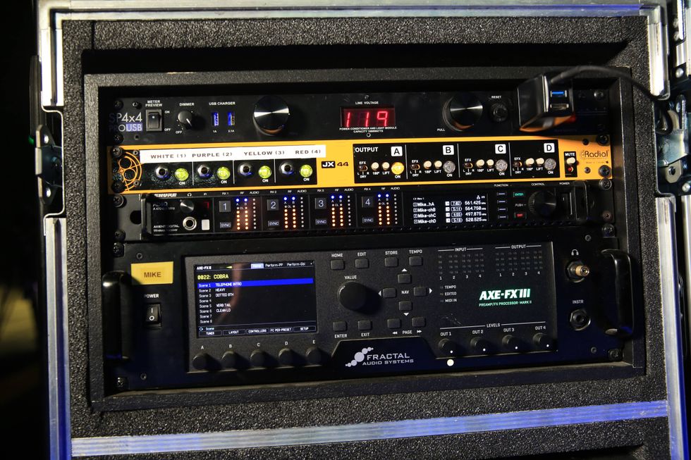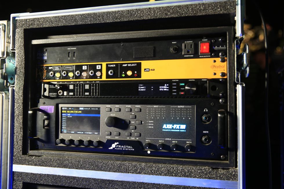 Stringer uses a Fractal Axe-Fx III, favoring a PVH 6160 model based on the EVH 5150 Stealth. It shares rack space with an ART Pro Audio SP4X4 power distribution system, Shure AD4Q, and Radial JX-44.