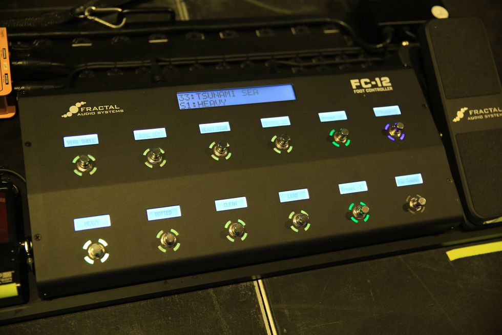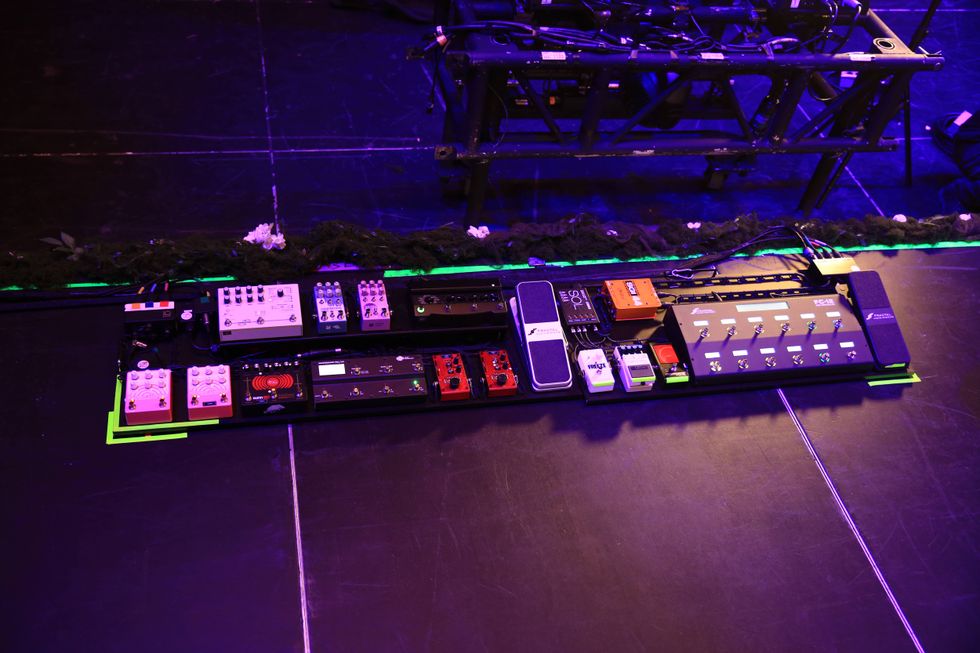 Stringer’s buddy at Omilion Audio built out his onstage boards. Along with a Fractal FC-12 Foot Controller, RJM Mastermind PBC/6X, and a Radial SGI-44, Stringer’s board carries a Peterson StroboStomp tuner, Boss DD-6, Electro-Harmonix Freeze, a pair of DigiTech Whammy Ricochets, Line 6 DL4 MkII, Chase Bliss Mood and Generation Loss, EarthQuaker Devices Sunn O))) Life, a pair of EarthQuaker Rainbow Machines, and a Hologram Electronics Microcosm.