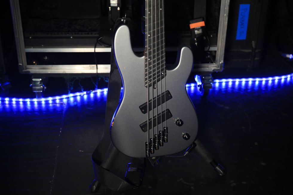 Modeled on Charvel’s San Dimas bass, this multi-scale (34-37") 5-string is tuned to F-sharp, and has Nordstrand pickups and a Darkglass B2M2 Tone Capsule onboard preamp. The custom-gauge strings come from Kalium Music.