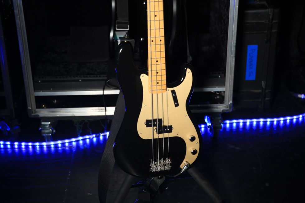 This Fender Precision bass is also on hand, tuned to B-A-D-G. It takes Ernie Ball strings.