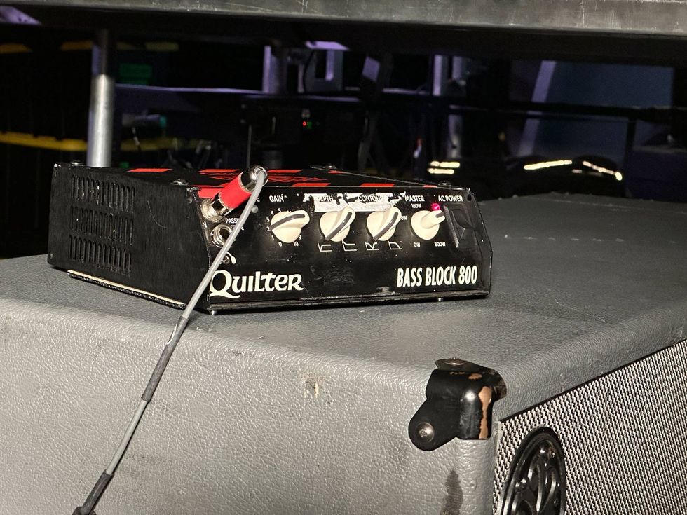 Along with his Quilter Bass Block 800, Gilbert, too, uses a Fractal Axe-Fx III, nestled in his backstage rack alongside a Shure AD4D and a Radial JX 42. Like Stringer, he uses a 6160 model for his dirty tones; a Darkglass B7K model is also in the mix. Gilbert’s tonal “scene changes” are handled in Ableton.