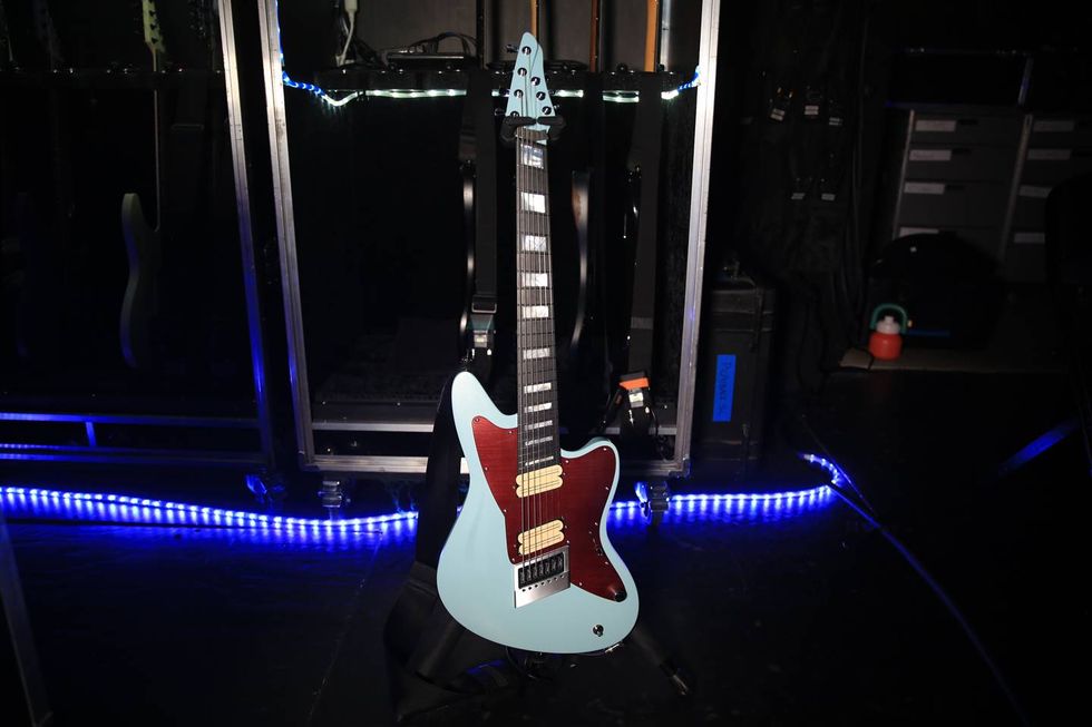 Stringer’s signature Aristides STX guitars, like this 7-string, are the first axes he reaches for. Inspired by Kurt Cobain’s Jag-Stang, the STX comes in 6-, 7-, and 8-string configurations, as well as multi-scale options. In lieu of traditional guitar woods, Aristides’ proprietary Arium material works perfectly for Stringer’s needs—it can hit any “stupid-low” tuning with ease and clarity. The guitar is loaded with Stringer’s signature Bare Knuckle Halcyon pickups and an EverTune bridge. The 7-string STXs are in F-sharp tuning, with Ernie Ball Custom Paradigm strings (.010–.074).