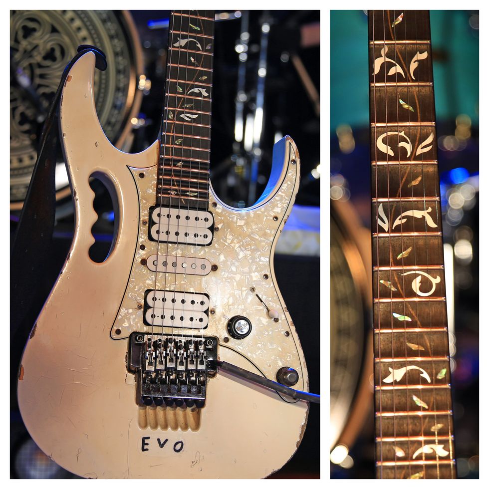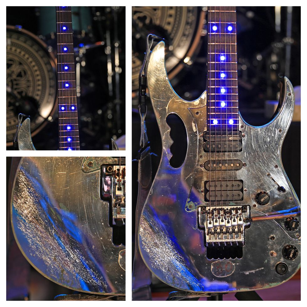 Currently on its fifth neck, Vai’s trusty axe has been a constant for touring and recording since roughly 1992. It sports DiMarzio “Evolution Bridge” pickups in both the neck and bridge position, “EVO gold” Jumbo frets, and a cosmo black Ibanez LO-PRO tremolo. Vai keeps this one in standard tuning, courtesy of .009-.042 Ernie Ball Super Slinkies.