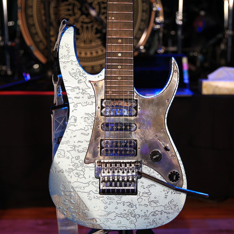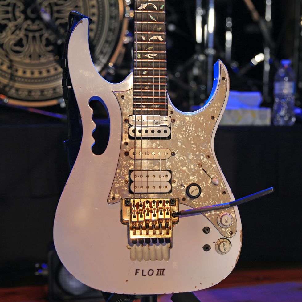 Flo III has been Vai’s main guitar since the late 2000s. This Jem was assembled at the Ibanez Los Angeles Custom Shop, where it was fitted with a Fernandes Sustainer, and modified with a lightly scalloped fretboard. It’s outfitted with EVO gold jumbo frets, a DiMarzio Evolution Bridge pickup, and an Ibanez LO-PRO tremolo. This one also lives in standard tuning, with .009-.042 Ernie Ball Super Slinkies.