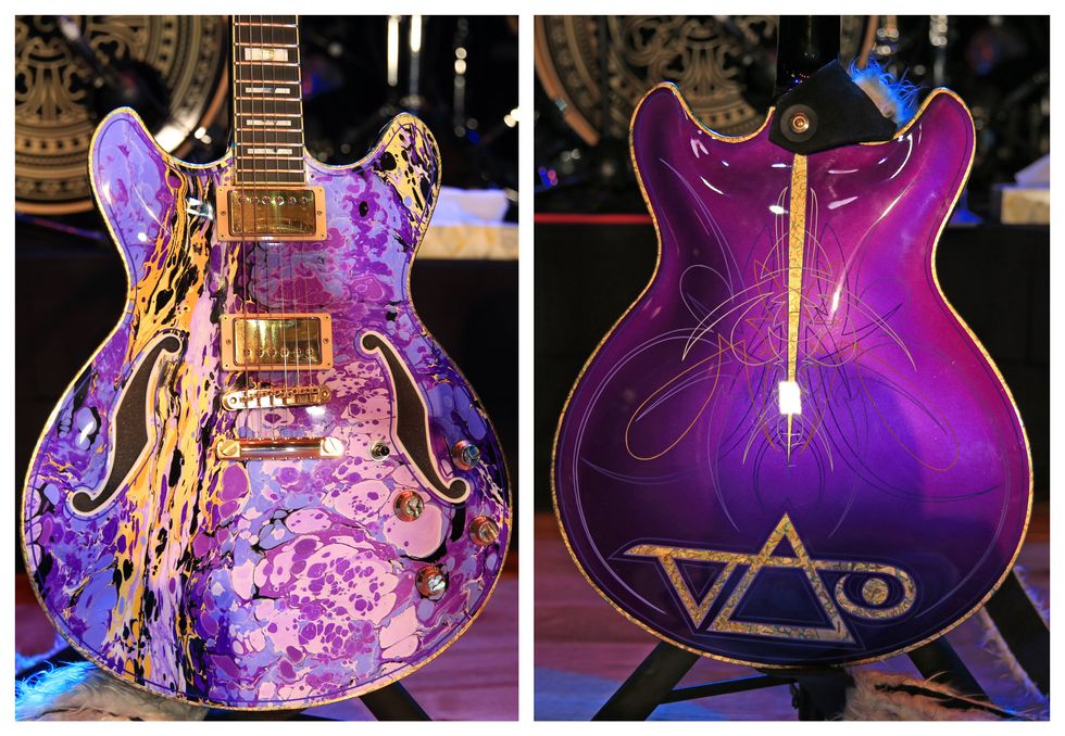 This one is a production model Ibanez John Schofield JSM, outfitted in a loud Bonvillain Dip, with gold leaf binding and unique pin-striping on the back. The electronics are stock, although the tone controls have been disconnected. Little Pretty sports locking Grover tuners, and a Tusq nut. Doug MacArthur has also re-radiused the fretboard to 16” throughout, and re-fretted it with Jumbo EVO gold fretwire, giving this guitar a very familiar feel to Vai. Plus, it’s gussied up with a very well-loved fluffy white strap!