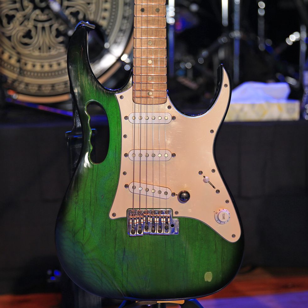 Made in the early 2000s by the Ibanez Custom Shop, this unique Jem/Strat hybrid boasts a classic sound while still maintaining the Vai aesthetic. It’s loaded with Fender Fat 50s single coils, a Wilkinson tremolo, and EVO gold jumbo frets over 21 frets with a custom 12” radius.