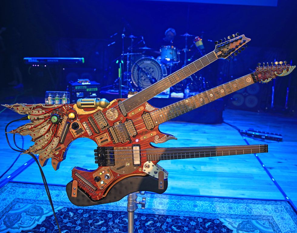 This Frankenstein monster, known as the Hydra, has one body, two headstocks, and three necks, accommodating both seven- and 12-string guitars as well as a four-string bass and half-fretless neck. Pickup combinations include a sustainer, humbuckers, single-coils, and a piezo. Oh, and did we mention there’s also a harp onboard?