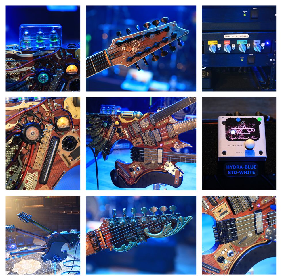 The ethernet plugs into a custom Hydra Brain built by Ibanez, which is mounted in the middle of the rack. The ethernet input distributes the signal for each individual instrument on the hydra, and the brain gives each instrument its own 1/4” output, as well as a master level control for each instrument. The harp, bass, and 12-string 1/4” brain outputs go into individual inputs of the AXE FX III TURBO, for the Hydra Song Patch. These three instruments utilize effects and amp modeling in the Fractal, and come out stereo to the front-of-house mixing console. The 7-string, however, doesn’t utilize modeling at all. Its output from the brain goes into the Little Lehle III A/B pedal on Vai’s pedalboard, which gets routed into his pedalboard and normal amplifier signal path. In other words, the 7-string runs through Steve’s rig just like his normal guitars.