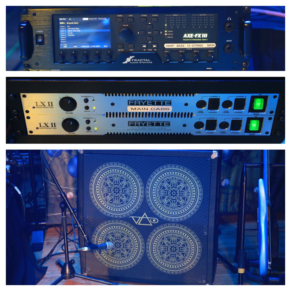 From the stereo output of the fractal, the left and right outputs now go into the left and right inputs of the Fryette LX-2 Stereo Tube Power amp. This power amp is 50 watts per-side, and both left and right are controlled via one single volume control, which allows Vai’s team to maintain even levels between the left and right guitar cabinets. Vai usually rides the volume around 1 or 2 o’clock (depending on the venue), with the depth control pushed in. A second LX2 powers Vai’s front-stage 1x12 stereo guitar monitors, which were custom-built by CARVIN.)