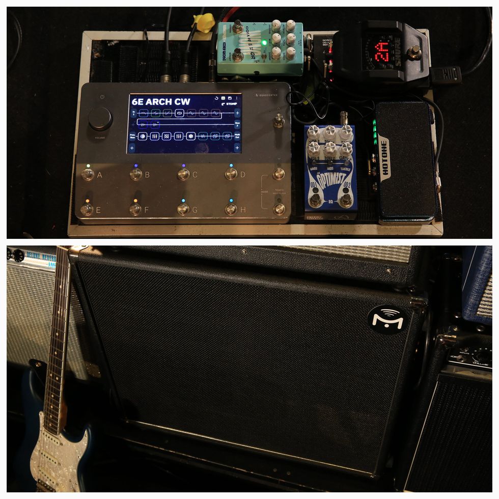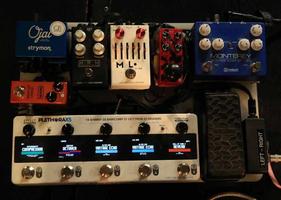 His signal first hits a Keeley Monterey Custom Shop Edition, followed by an MXR Deep Phase, J. Rockett HRM, J. Rockett Melody OD (Lettieri’s signature), Pigtronix Octava, and a Dunlop DVP4, all powered by a Strymon Ojai. A TC Electronic TonePrint Plethora X5 pedalboard handles coordination and switching between the devices.