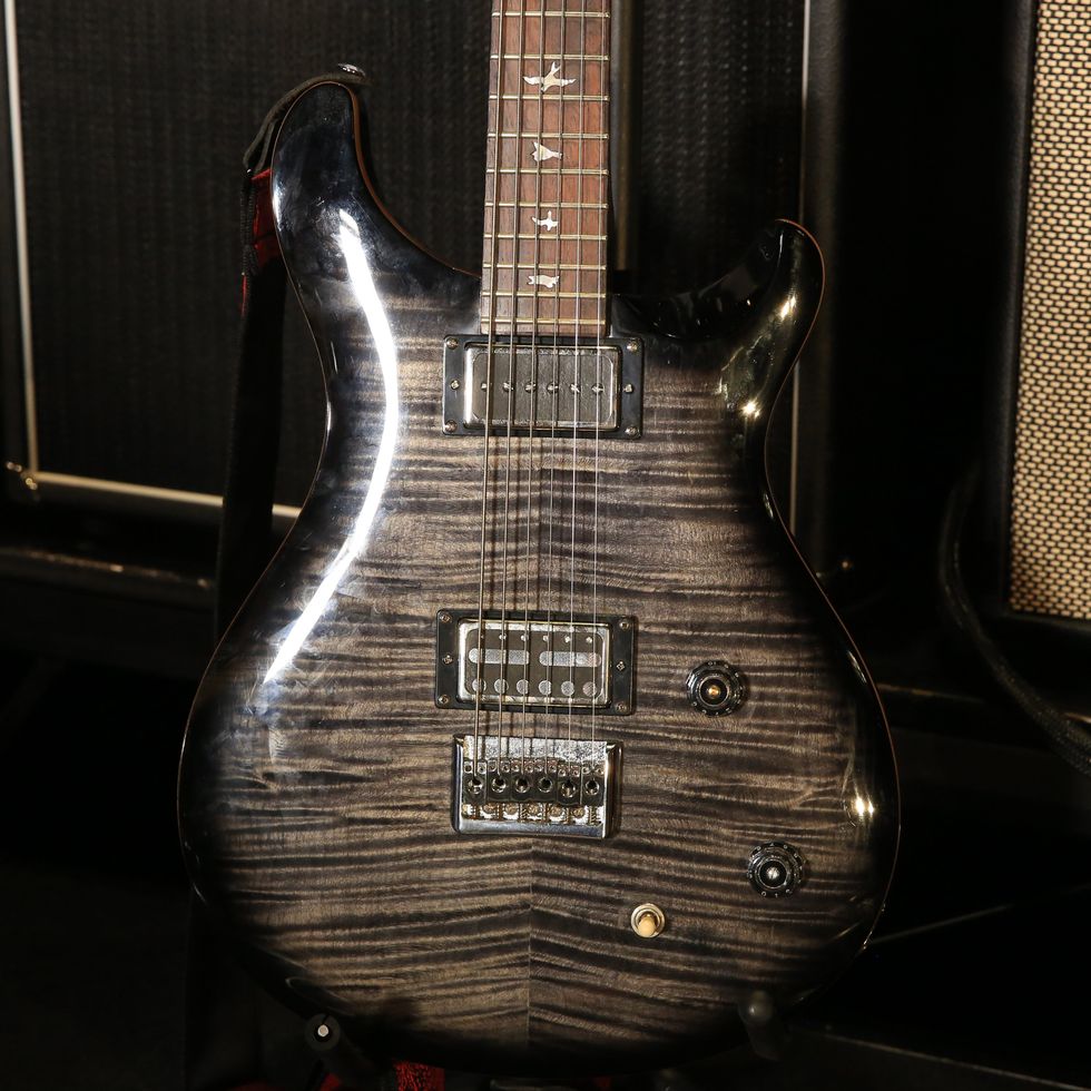 Lettieri also calls on this PRS SE 277 baritone guitar. He’s swapped the pickups for a Lollar P-90 in the neck position and a gold-foil in the bridge. He tunes it to A standard and runs .014–.072 strings on it.