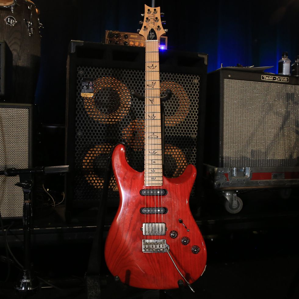 Lettieri flies with his signature PRS Fiore (and wears a matching shirt to boot). The model, which he began designing with PRS in 2019, has a swamp ash body, maple neck, 25 1/2" fretboard, nickel frets, and a pickup system that allows for 11 different combinations—the ultimate studio weapon. He runs it to his board with Revelation Cable Company cables. Lettieri strings it with Dunlop .010s, and strikes them with Dunlop celluloid picks.