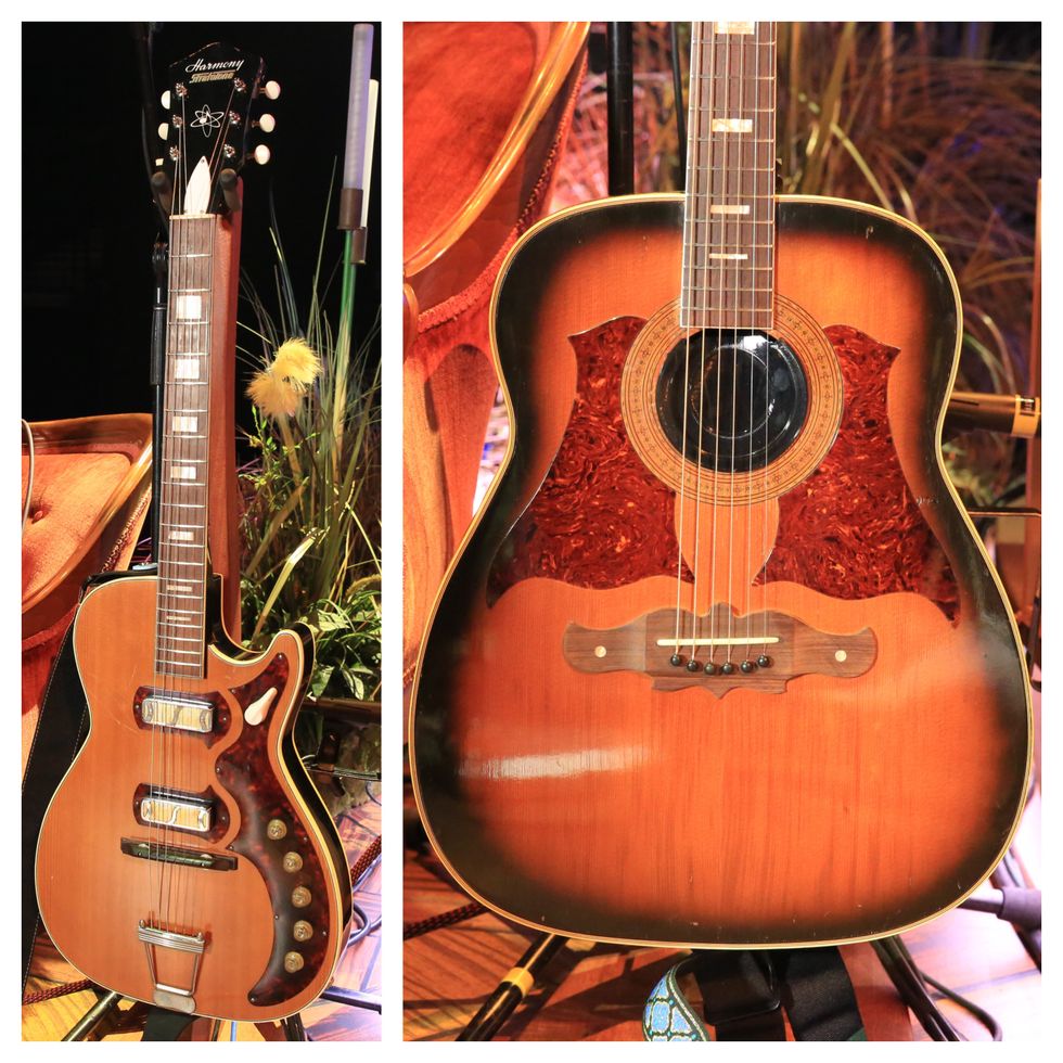 These old beauts are a pair of vintage Harmony instruments. The electric on the left is a 1960 Stratotone that’s been overhauled with stainless-steel frets, Waverly tuners, and a proper setup. The big boomer on the right is a 1960s H1266 Sovereign Deluxe that also has been upgraded with stainless-steel frets and plays like a dream. The H1266 has a midrange like a Mack truck and sat in the mix really well for the Rustin’ in the Rain sessions. All of his acoustics take D’Addario XTAPB1356 XT Phosphor Bronze strings and his Stratotone uses D’Addario NYXL1149 Nickel Wound strings.