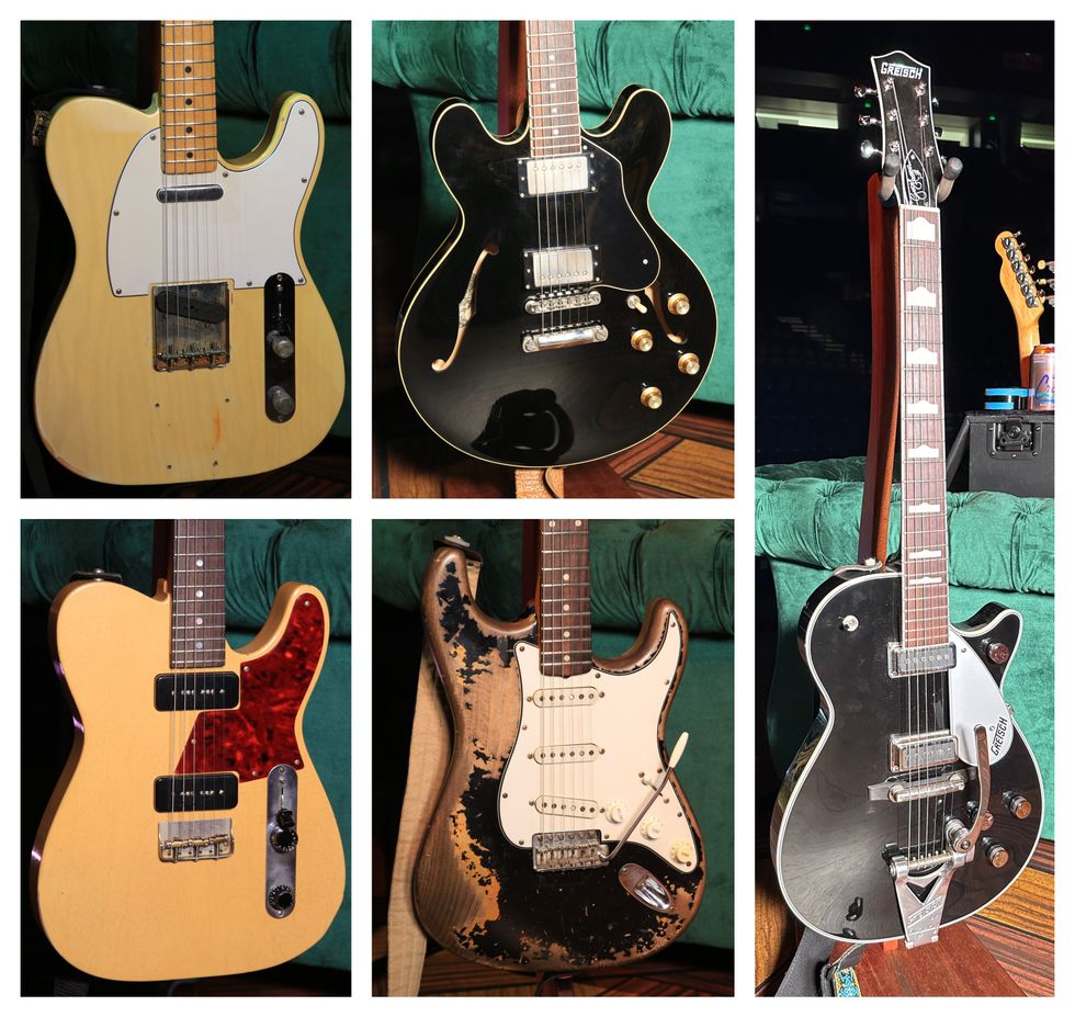“This is the heartbeat of my rig,” contends Jesse Wells. The kickstart to his rig’s heart is a 1968 Fender Telecaster (top left) that once upon a time had a Bigsby vibrato on it. He bought it off Food Stamps’ tech Patrick Boyle, who still gets to see his old friend every night. The ES-style guitar is a Collings I-35 (top right) has been upgraded with ThroBak PAF humbuckers. RS Guitarworks (lower left) created this Slab Series mashup that blends a T-style with an LP Junior. The pickups are a set of growly Fralin Soapbar P90s. One of the Bluegrass State brothers built him this relic’d partscaster that has a set of Ron Ellis 64S single-coils. And on the far right is a Gretsch G6128T-GH George Harrison Signature Duo Jet that Wells wanted for mellower vibes, and into which he dropped a set of Ron Ellis Ellisonic JLs codesigned by the masterful Julian Lage.