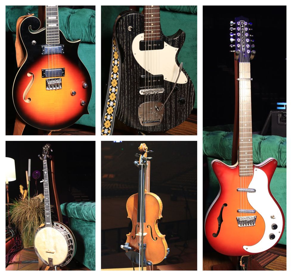 As the man in the band that wears the most hats, Jesse Wells carries a lot of auxiliary instruments. Starting with the Eastwood MRG Tenor (top left), a fancy little unit with mini humbuckers. Next is the Collings 360 Baritone that has a 27.5" scale length and custom Lollar Alnico Pole P90s. Then he has the Gibson RB-250 5-string banjo and a violin handmade by Jonathan Cooper out of Portland, Maine. On the far right is Wells’ Danelectro 59X12 12-string.