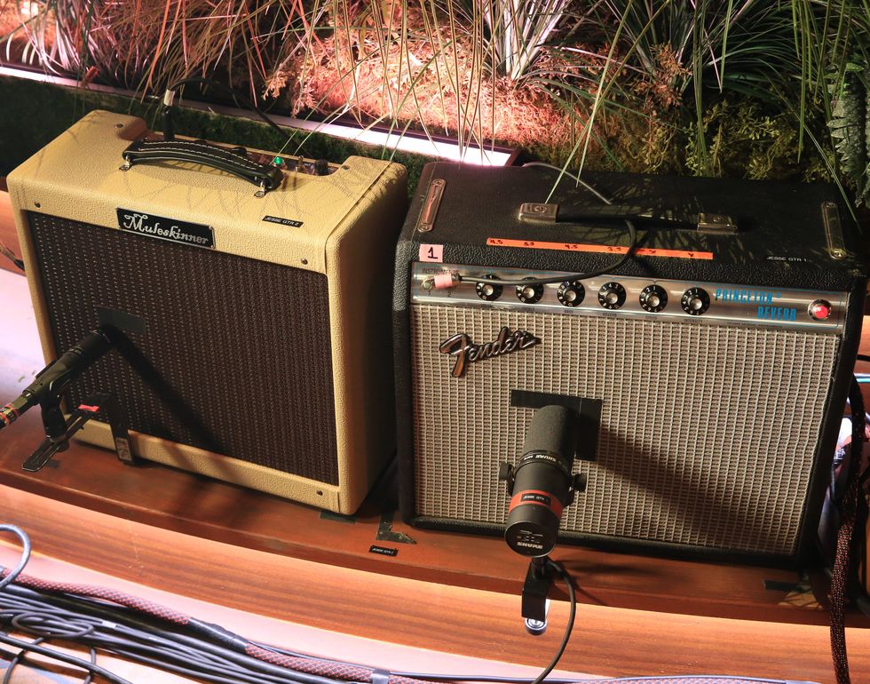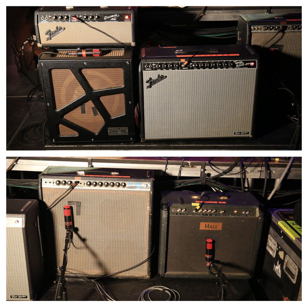 Letting FOH and PA do a lot of the work, Jesse utilizes a pair of puny punchers—a Muleskinner Tweed based on the 5E3 circuit with a couple 6V6s, and a 1974 Fender Princeton Reverb.