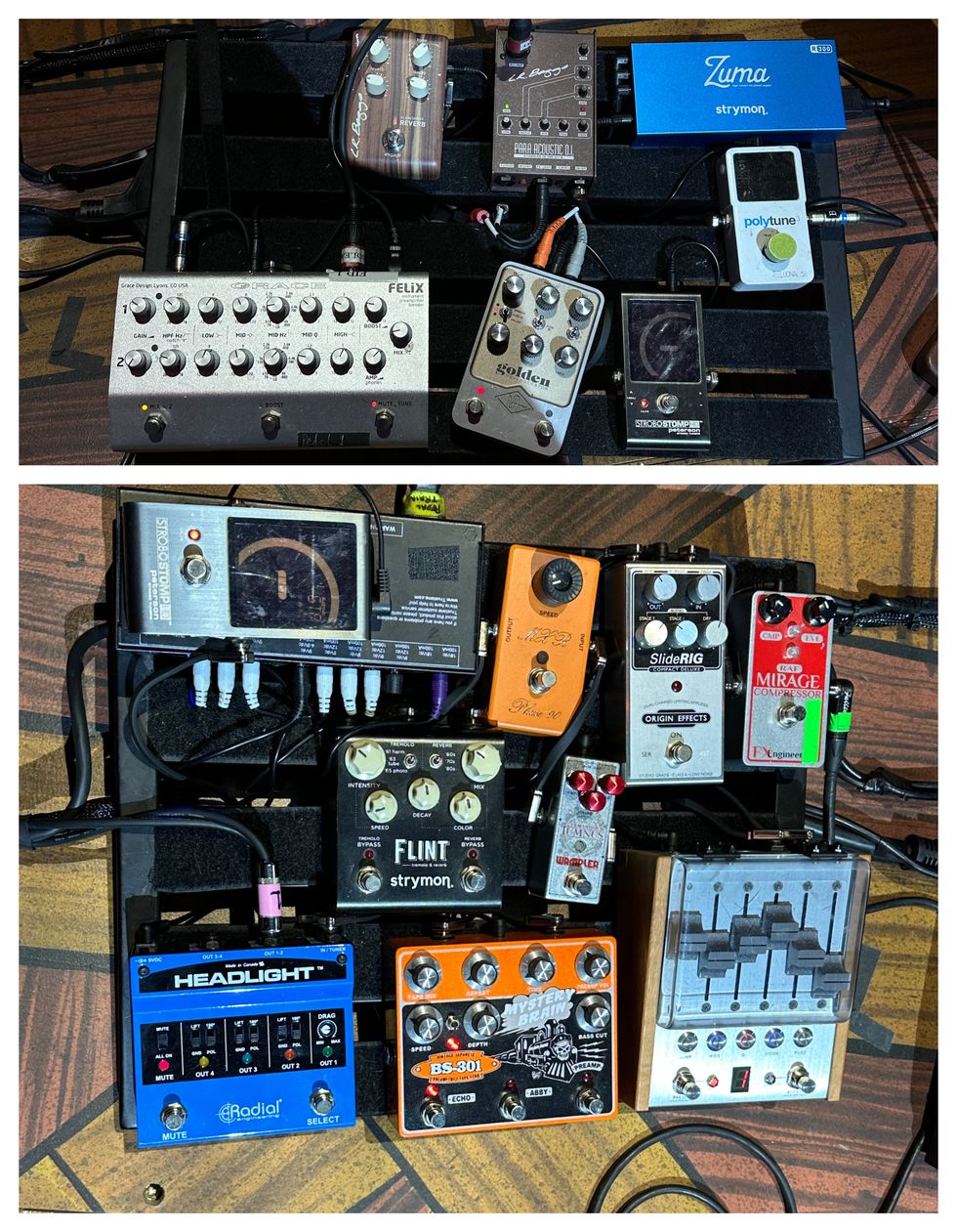 Covering his coloring, switching, and tuning needs for flattops and mandolin are a Strymon Flint, another JHS Pulp ’N’ Peel, a Grace Design ALiX preamp, a Keeley Mini Katana, a L.R. Baggs Venue DI, a Morley ABC Pro Switcher/Combiner Pedal, and a pair of Peterson StroboStomps.