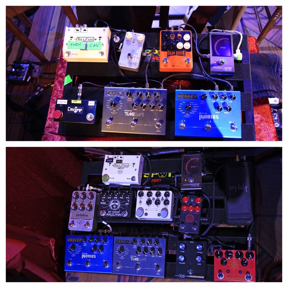 To accommodate his dual duties, he’s got a pair of pedalboards. Up top is his steel board that uses a Keeley Omni Reverb, Keeley D&M Drive/Boost, Strymon Mobius, and Strymon TimeLine. A Fulltone True-Path ABY Soft Touch switcher controls the amps, while a CavAmp box handles the rotary speaker speeds and stops. His steel is kept in check with a Peterson StroboStomp HD tuner.