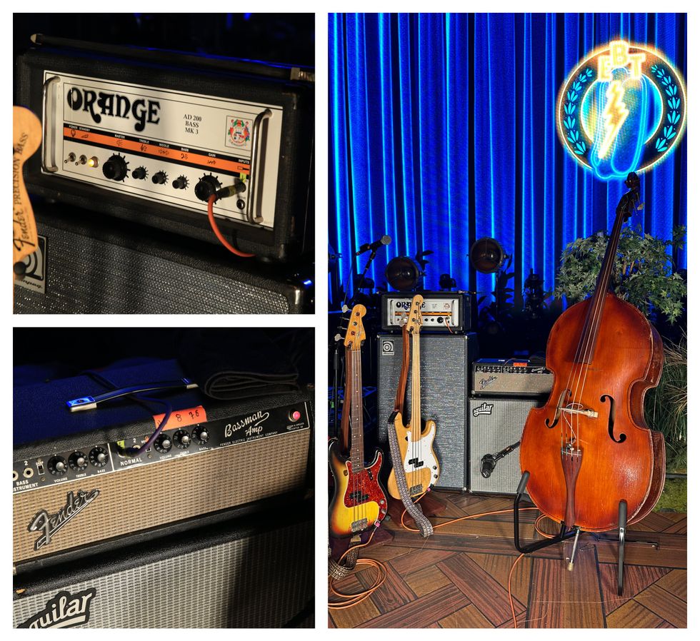 Burletic brings the low-end rumble with a pair of thunder buddies—an Orange AD200B MK3 200-watt bass head and an old Fender Bassman. The Orange goes into a Ampeg Heritage SVT 610AV cabinet while the Fender runs through an Aguilar DB 410 cab. And you gotta love the looks of his full setup glowing under the EBT (Eatin’ Big Time) logo.